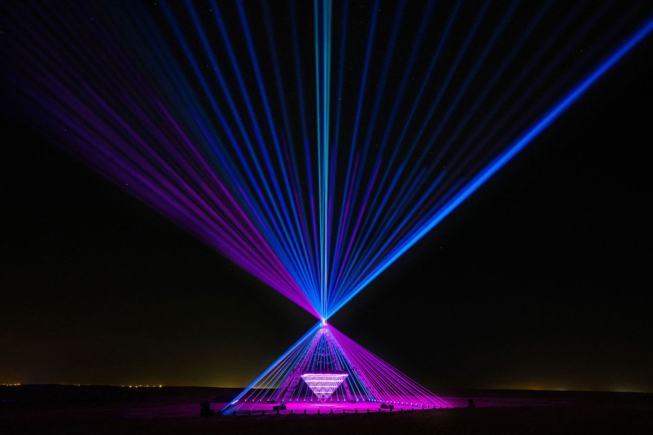 In November 2022, AXION, a large-scale light installation was presented at Noor Riyadh, a citywide annual festival of light and art. Like a giant spaceship, the AXION artwork by light artist Christopher Bauder and composer and musician KiNK sits in the middle of the desert.